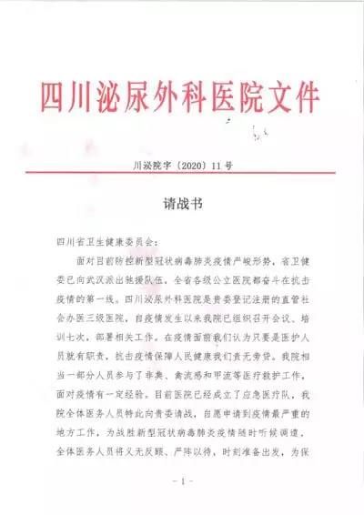 1月28日集團(tuán)旗下四川省泌尿外科醫(yī)院黨政工群各級領(lǐng)導(dǎo)干部、防控應(yīng)急醫(yī)療隊(duì)和醫(yī)院技術(shù)骨干100余人召開請戰(zhàn)大會,主動向省衛(wèi)健委請戰(zhàn)馳援武漢,請戰(zhàn)書已于當(dāng)日送達(dá),省衛(wèi)健委對醫(yī)護(hù)人員積極抗擊疫情給予肯定贊揚(yáng),并指示爭取第三批次派遣醫(yī)護(hù)人員前往疫區(qū)第一線。1月31日起,該院根據(jù)省中醫(yī)管理局公布的冬春季呼吸道傳染病預(yù)防建議處方,緊急熬制中藥湯劑,免費(fèi)向市民發(fā)放,每天限量供應(yīng)1000人份(6000袋)。